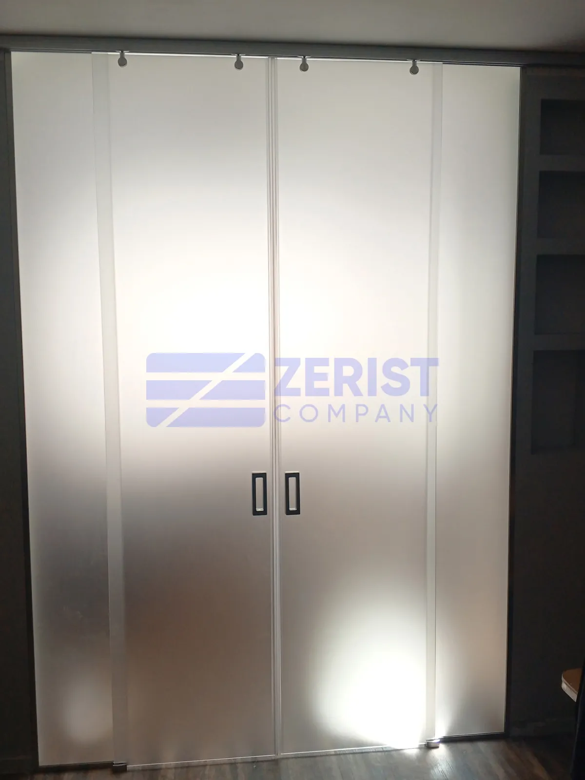 Установили раздвижные двери из осветленного матового стекла толщиной 10 мм. Использовали алюминиевую фурнитуру, обеспечивающую стильный и современный вид.