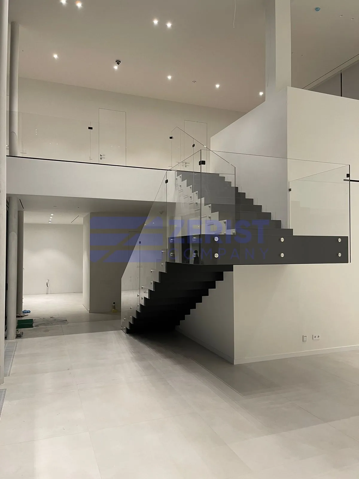 Для ограждения было использовано листовое стекло толщиной 10 мм. Этот материал идеально подходит для таких конструкций, так как сочетает в себе прочность и изысканный внешний вид. Мы выбрали стекло Crystalvision, которое отличается кристальной прозрачностью и позволяет создать эффект легкости и воздушности. Это особенно важно для современных интерьеров, где ценится визуальная свобода пространства.