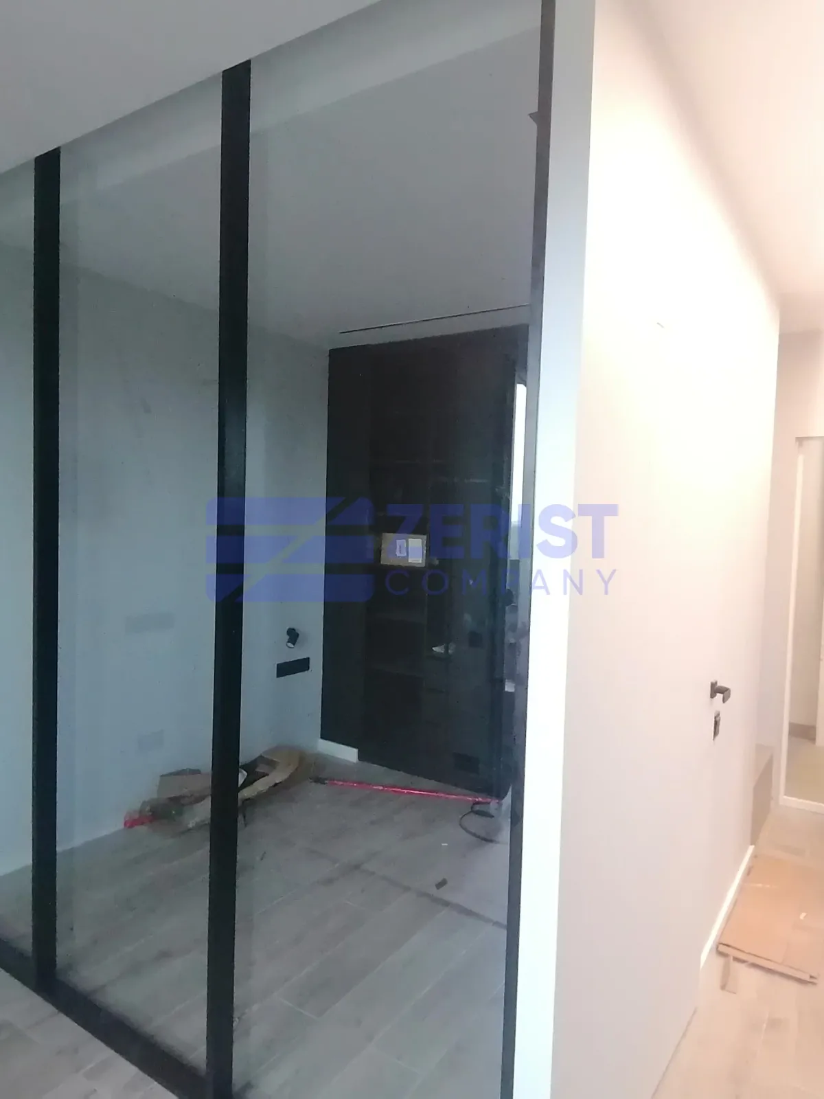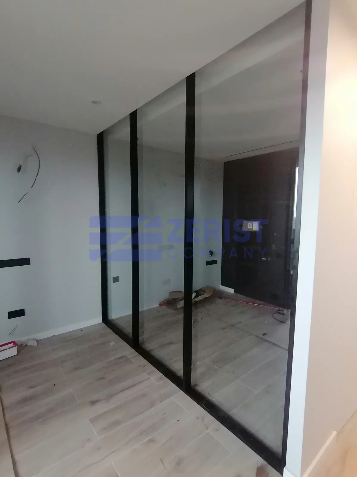 По готовому дизайн-проекту специалистами нашей компании была изготовлена и смонтирована "глухая" каркасная перегородка из бесцветного стекла толщиной 6 мм. Общая площадь готового изделия 7 кв. м. Фурнитура: производство «ФРИСТАЙЛ ТЕХНОЛОДЖИ», цвет черный.